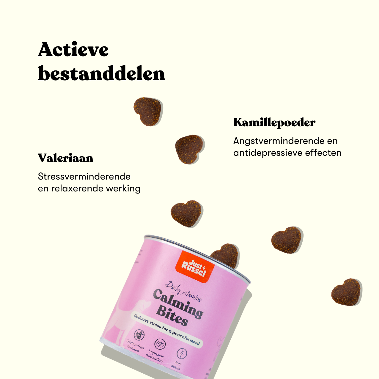 Kamille, Valeriaanbladpoeder, biergist, kamillepoeder (3,6%), paardenbloempoeder, brandnetelpoeder, microalgen schizochytrium, hennepzaadpoeder, pluimveevet, valeriaanbladpoeder (0,7%), gemberwortelpoeder, inuline, MOS, FOS, rozemarijnpoeder, rood zeewiermeel, bèta-glucaan (0,01%). Inactief: Rijstmeel, water, plantaardige glycerine, gehydrolyseerde kippenlever